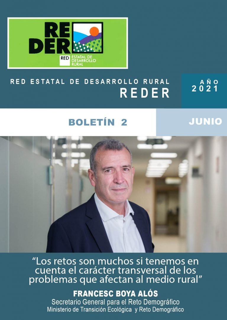 SEGUNDO BOLETÍN REDER 2021. Contenidos: Editorial Entrevista a Francesc Boya Alós. Secretario general para el Reto Demográfico, Ministerio de Transición Ecológica y Reto Demográfico Plan de Medidas ante el Reto Demográfico Campaña “Mira el Origen“ BANCO DE RECURSOS, PROYECTO DE COOPERACIÓN “Apoyando Iniciativas de Repoblación y Emprendimiento AIRE RURAL“ Entrevista a Juan Bautista Alonso, gerente…