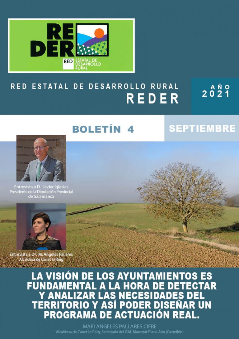 CUARTO BOLETÍN REDER 2021 Contenidos: Editorial Entrevista a Javier Iglesias. Presidente de la Diputación Provincial de Salamanca Entrevista a M. Angeles Pallares Cifre. Alcaldesa de Canet lo Roig, Diputada Provincial de Castellón y Secretaria del GAL Maestrat Plana Alta (Castellón) Reunión del partenariado plenario para la preparación del Plan Estratégico PAC 2023-27 El Consejo y…