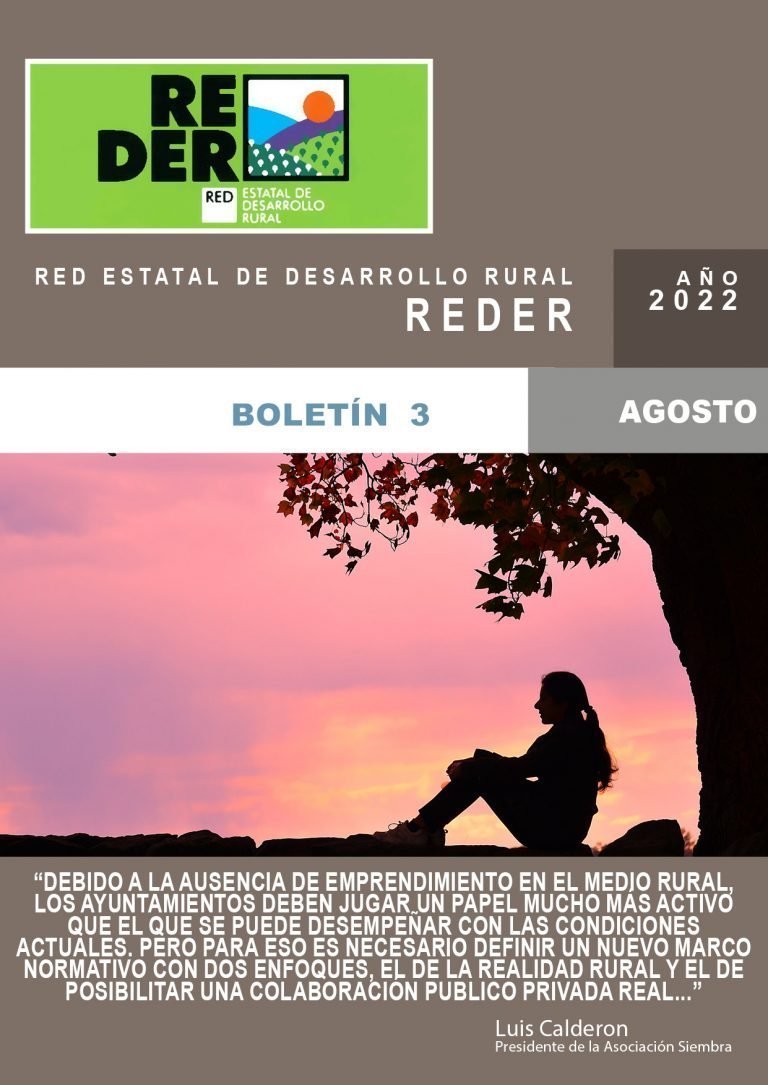 TERCER BOLETÍN REDER 2022 Contenidos: Editorial Entrevista a Luis Calderón Nájera. Presidente de la Asociación Siembra Resumen de la reunión virtual mantenida por REDER con D. Fernando Miranda, Secretario General de Agricultura y con Dña. Isabel Bombal, D.G de Desarrollo Rural, Innovación y Formación, ambos representantes del Ministerio de Agricultura, Pesca y Alimentación. Resumen de…
