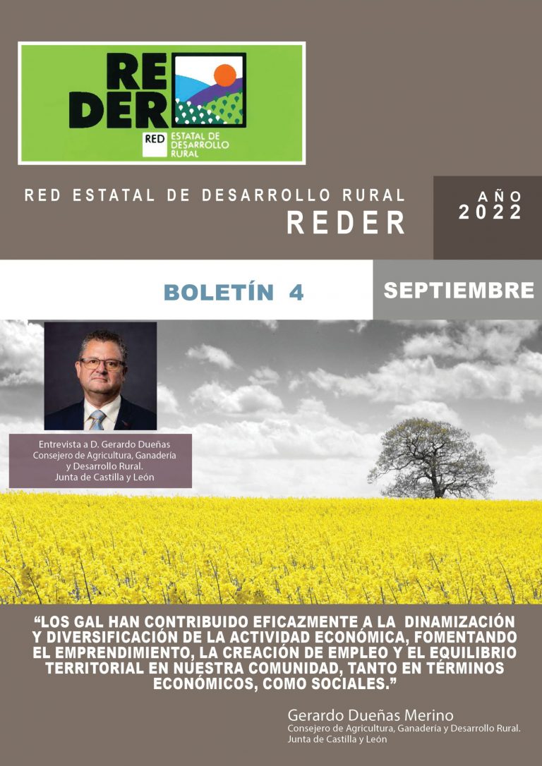 CUARTO BOLETÍN REDER 2022 Contenidos: Editorial Entrevista a Gerardo Dueñas Merino Consejero de Agricultura, Ganadería y Desarrollo Rural de la Junta de Castilla y León. El Plan Estratégico de la PAC 2023-2027 presentado por España, aprobado por la Comisión Europea. Propuesta de PRINCAL para la implementación del programa LEADER periodo 2023-2027. El MAPA impulsa la…