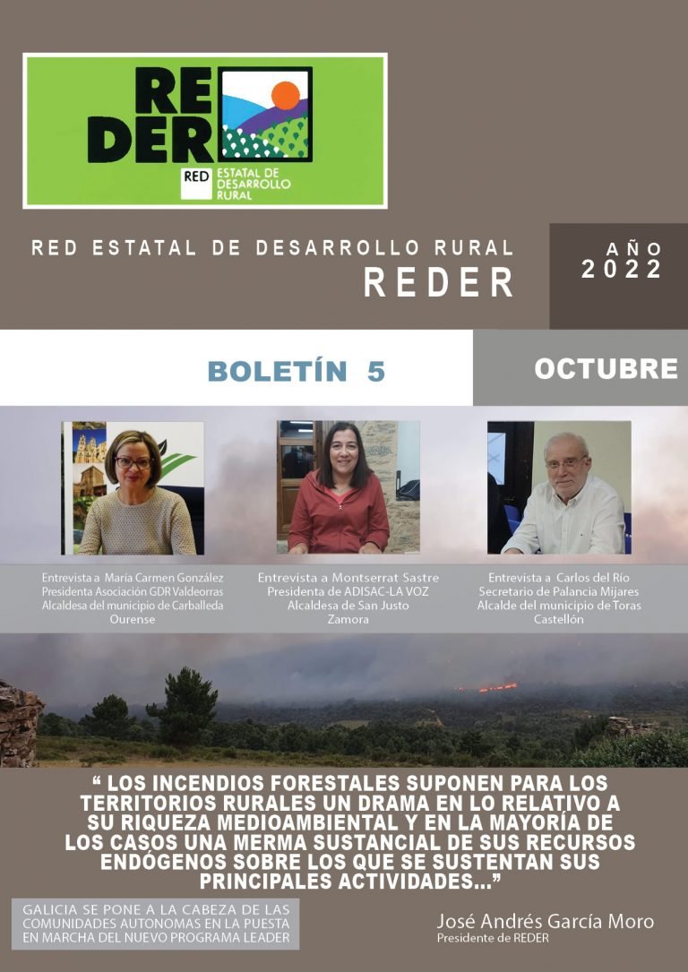 QUINTO BOLETÍN REDER 2022 Contenidos: Editorial Entrevista María Carmen González. Presidenta Asociación GDR Valdeorras. Alcaldesa del municipio de Carballeda. Ourense Entrevista a Montserrat Sastre Presidenta de ADISAC-LA VOZ. Alcaldesa de San Justo. Zamora Entrevista a Carlos del Río. Secretario de Palancia Mijares. Alcalde del municipio de Toras. Castellón El secretario general de Agricultura destaca que…