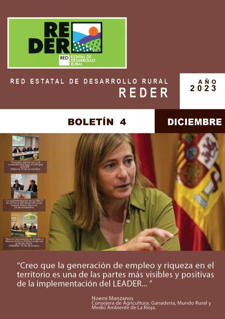 Os adjuntamos enlace al cuarto boletín de REDER 2023 confiando en que sea de vuestro interés: Contenidos: Editorial Entrevista a Noemí Manzanos, Consejera de Agricultura, Ganadería, Mundo Rural y Medio Ambiente de La Rioja. Seminarios REDER: “Fomento del turismo y la sostenibilidad bajo el enfoque LEADER “. Valencia 14 de noviembre. “La implementación de las…