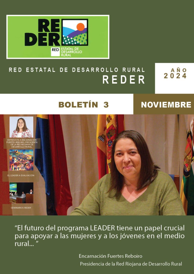 Os adjuntamos enlace al tercer boletín de REDER 2024 confiando en que sea de vuestro interés: Contenidos: Editorial Entrevista a Encarnación Fuertes Reboiro presidenta de la Red Riojana de Desarrollo Rural El LEADER a evaluación Seminarios REDER 2024: Galicia y La Rioja Enlace de descarga: Descarga boletín 3 REDER 2024 boletin32024hojassueltas