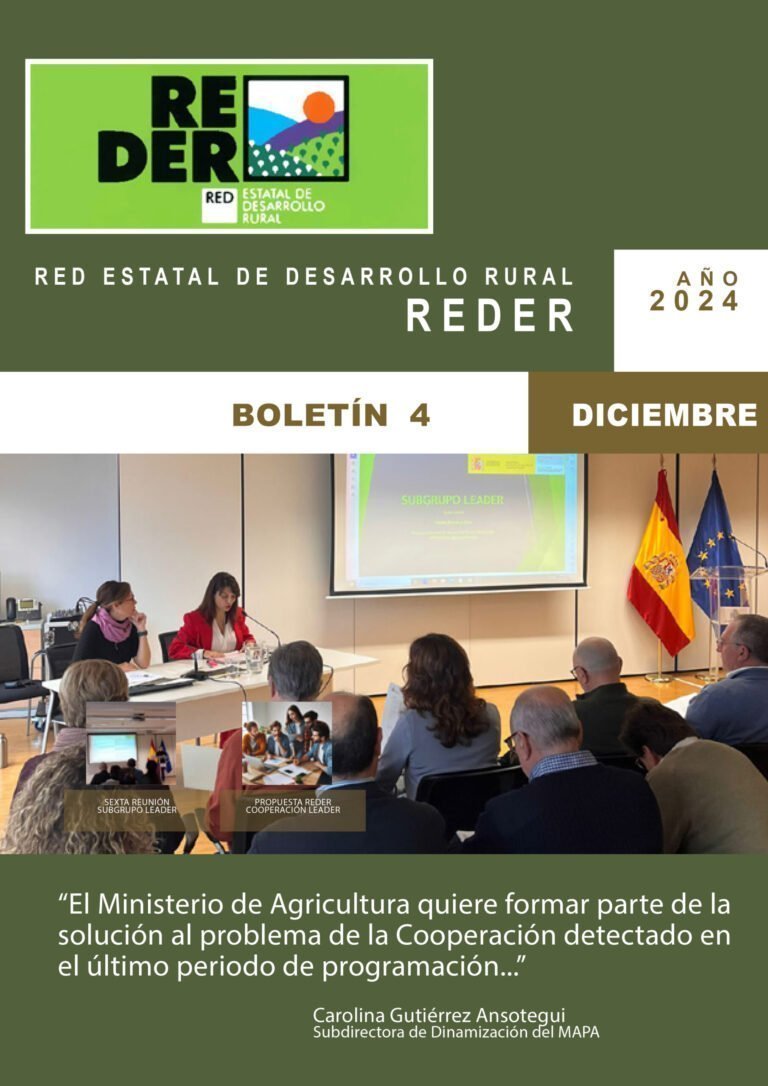 Os adjuntamos enlace al cuarto boletín de REDER 2024 confiando en que sea de vuestro interés: Contenidos: Editorial Propuesta de REDER cooperación Reunión subgrupo LEADER Enlace de descarga: BOLETIN REDER 4 2024