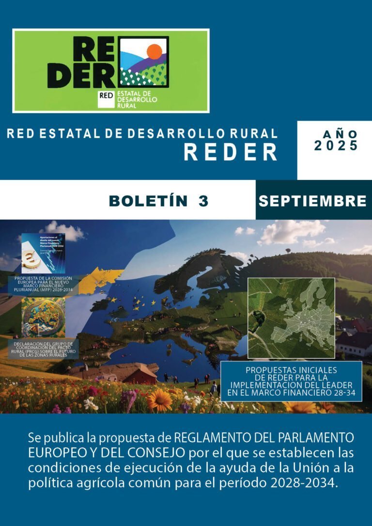Os adjuntamos enlace al tercer boletín de REDER 2025 confiando en que sea de vuestro interés: Contenidos: – Editorial – Propuesta de la Comisión Europea para el nuevo Marco Financiero Plurianual (MFP) 2028-2034 – Declaración del Grupo de Coordinación del Pacto Rural (PRCG) sobre el futuro de las zonas rurales y la política de desarrollo…